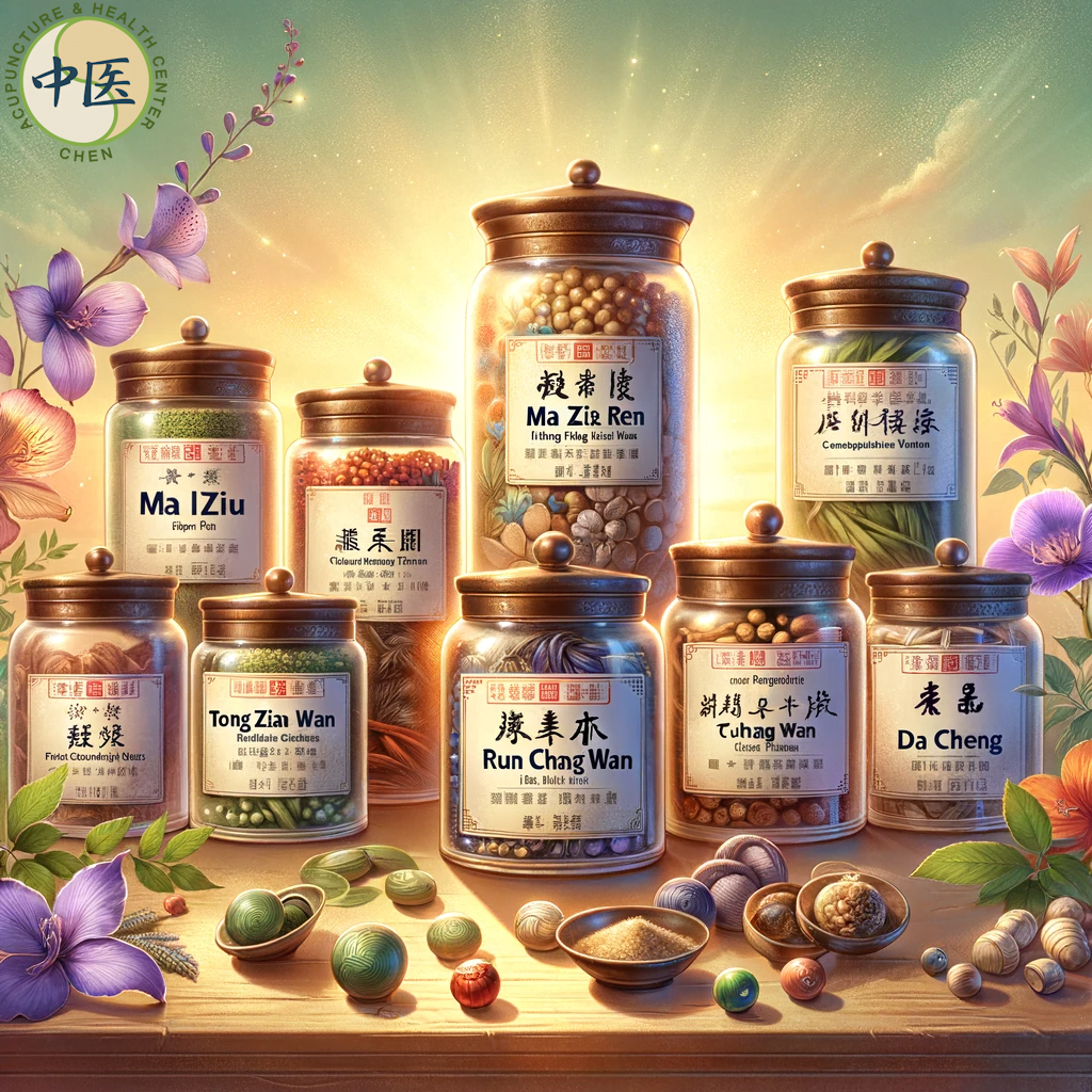 - Run Chang Wan: Bestaat uit lijnzaad, perzikpit, en rabarber, en richt zich op het hydrateren van de darmen en het vergemakkelijken van een soepele stoelgang.