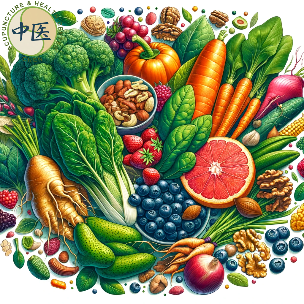 - Bessen: Blauwe bessen, frambozen en zwarte bessen zijn rijk aan antioxidanten, die vrije radicalen bestrijden en de huid beschermen. Dit sluit aan bij de theorie van de vijf elementen, waarbij de kleur blauw/zwart overeenkomt met het water-element, dat de nieren ondersteunt. Gezonde nieren zijn volgens TCM belangrijk voor een gezonde huid.