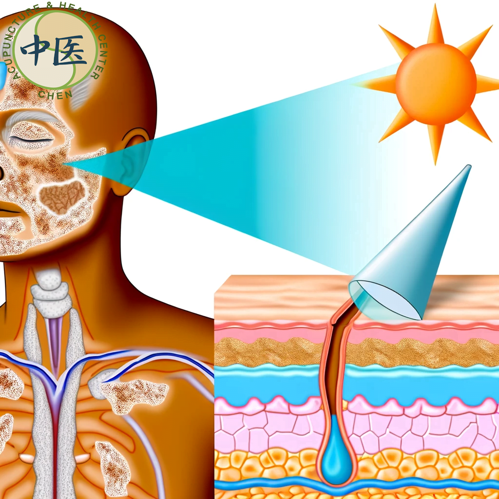 In contrast, de traditionele Chinese geneeskunde (TCG) ziet ouderdomsvlekken als een teken van onderliggende disharmonieën binnen het lichaam. Volgens TCG zijn deze vlekken vaak gelinkt aan Qi- of bloedtekort. Of aan stagnerend leverbloed, dat warmte of vocht ophoopt op de huid (Maciocia, 2015). TCG-diagnose beoordeelt de algehele gezondheid en organen. Dit gebeurt via tong- en polsdiagnostiek.