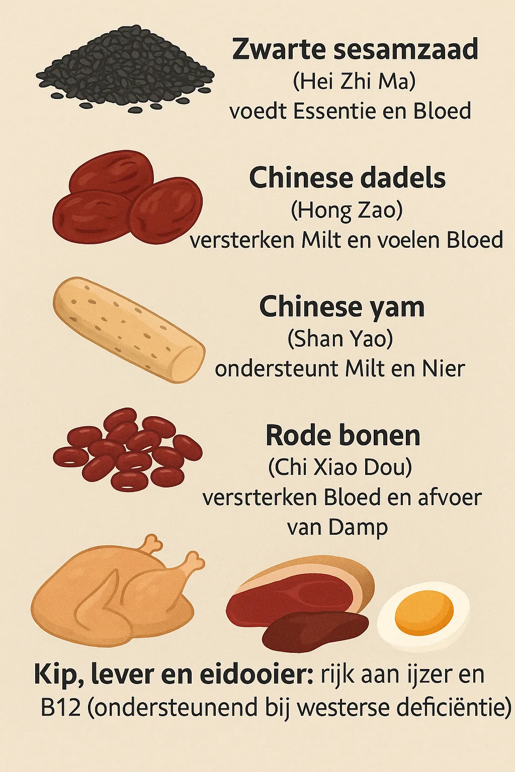 Voeding is een essentieel onderdeel binnen de TCM-aanpak bij anemie. Het doel is om Bloed op te bouwen en de Miltfunctie te versterken.