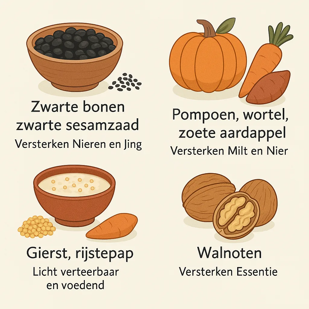 TCM benadrukt zachte, verwarmende voeding die de Milt en Nieren ondersteunt. Koude, rauwe of zware voedingsmiddelen worden afgeraden.