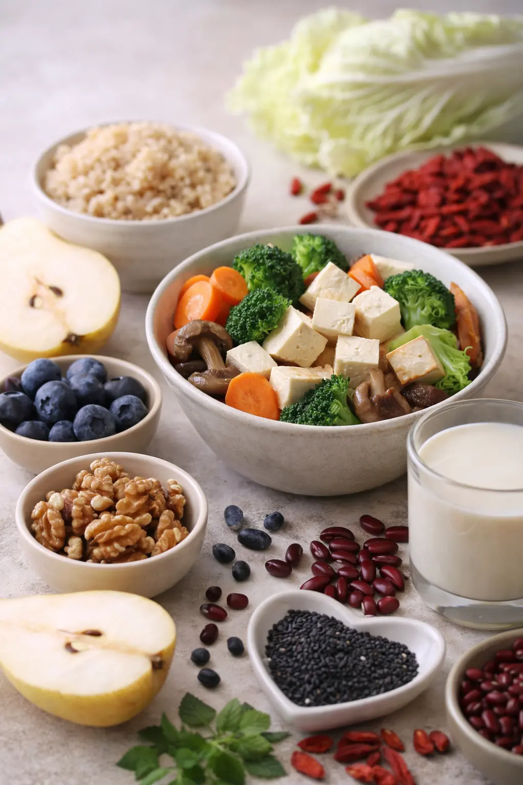 Kies daarnaast voor volwaardige eiwitbronnen en een breed voedingspatroon. Denk aan vis, eieren, tofu, peulvruchten, yoghurt, noten en zaden. Ook fruit, groenten en volkorenproducten passen goed binnen een rustige opbouw. De NHS adviseert rond de overgang een gezonde voeding met veel groente, fruit en calciumbronnen zoals melk, yoghurt en boerenkool, mede met het oog op botgezondheid. Binnen een TCM-benadering kiest men daarnaast vaak voor zacht bereide, voedzame maaltijden boven extreme diëten of lange periodes zonder eten. Voor sommige vrouwen kunnen ook sojaproducten logisch aanvoelen binnen een gevarieerd voedingspatroon. The Menopause Society noemt soja en andere voedingsaanpassingen als opties die soms worden geprobeerd, al blijft het effect per persoon verschillend.