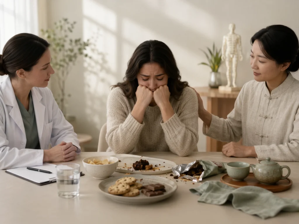 Binnen de TCM vermijden therapeuten vaak voeding die zwaar, vet, sterk bewerkt of erg onregelmatig wordt gebruikt wanneer iemand zich gespannen, vol, traag of emotioneel ontregeld voelt. Denk aan veel fastfood, gefrituurd eten, grote hoeveelheden suiker, energiedrank, alcohol en sterk bewerkte snacks. Zulke keuzes passen meestal minder goed bij een rustig dagritme en een stabiele opbouw van energie en verzadiging. Binnen de TCM-visie wordt dan vaak gezegd dat te rommelige of te zware voeding het systeem eerder belast dan ondersteunt. Voor mensen met eetbuien geldt bovendien dat een patroon van extreme restrictie gevolgd door sterk bewerkt “troosteten” vaak minder goed past bij herstel dan een volwaardig en voorspelbaar eetpatroon. De NHS noemt schuldgevoel, geheimhouding en herhaalde eetepisodes als kenmerkende onderdelen van binge eating disorder; juist daarom is een stabieler patroon meestal zinvoller dan een alles-of-nietsbenadering.