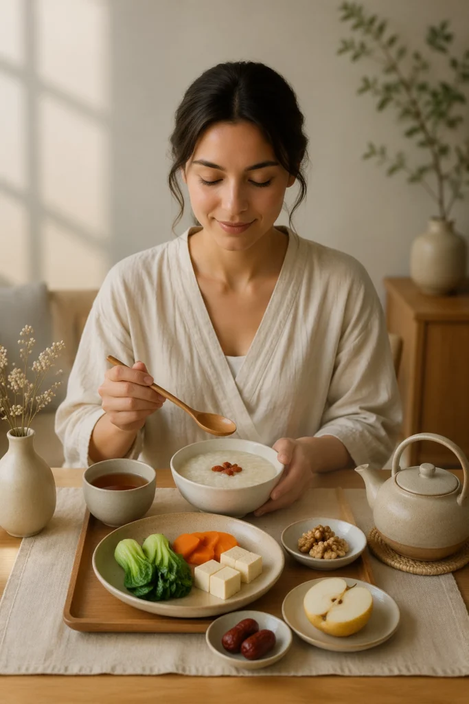 Voeding werkt in de TCM vooral via opbouw, vertering en balans. Binnen deze visie moet het lichaam voeding eerst goed kunnen omzetten voordat rust, belastbaarheid en stabiliteit goed worden ondersteund. Daarom krijgt de spijsvertering veel aandacht. De gebruikte begrippen, zoals Qi, Yin en Yang, komen uit de TCM en zijn geen één-op-één medische termen. Vanuit die logica worden warme, eenvoudige en regelmatige maaltijden vaak gezien als vriendelijker voor het systeem dan koude, zware of onregelmatige voeding. Daardoor past een rustige maaltijdstructuur beter bij mensen die naast eetdrang ook sneller vermoeid, gejaagd of uit balans aanvoelen.